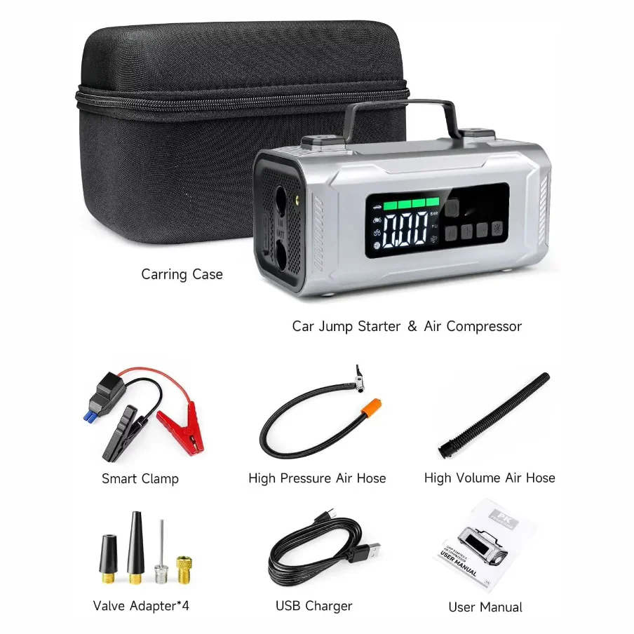 6 in 1 Functions.. With car jump start Tire Inflator Tire pressure monitoring Blowing machine Vacuum pumping Power bank Specification Charging Output USB-C Function With LED Light, Car jump starter, Car Power Bank, Car Battery Charger Use Passenger Car, Motorcycle Place of Origin China Zhejiang Type Emergency Tool Kit Input 12 V, type-c 12v peak current 800A Cycle Life 1000x Total Output 45 W Model Number LH0618 Color Black Product name Car Jump Starter with Air Compressor Color Black Material ABS Wieght 1.8kg Rated power 80W Rated Voltage 14.8V Battery Capacity 8000 Charger time 4-5H Start Current 1000A Air Compressor 150PSI